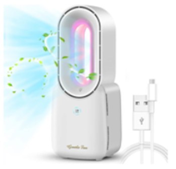 Ventilatore da tavolo senza pale, a batteria ricaricabile 2000mha, 3 velocita , pannello touch, luce a 5 colori, durata carica 4h alla velocita minima o 1,5h alla velocita massima
